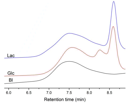 MW analysis showed that the catalytic system (γ-Al2O3/TBHP) allows for achieving better molecular weight increases more intensely. This effect is most effectively observed in the polycondensation process for 24 h with butyl lactate (Mn = 6900 g·mol−1). The low polymer yield when using Lac and Glc as comonomers may be attributed to the release of water as a by-product during the addition of the lactide/glycolide fragment to betulin. This water, in turn, leads to the reduction of lactide/glycolide to lactic/glycolic acid. These acids then form lower molecular weight polymers with betulin, as evidenced by GPC chromatograms (Figure 8).