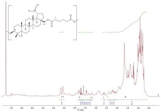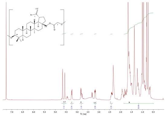 In the case of the copolymerization of betulin and AA (Figure 2), a copolymer with a number-average molecular weight of 1600 g·mol−1 was obtained (Table 3). This value is in good agreement with the values of MW presented in the literature [] for the copolymerization of betulin and AA (1400 g·mol−1). The structure of the copolymer was confirmed by 1H NMR (see below).