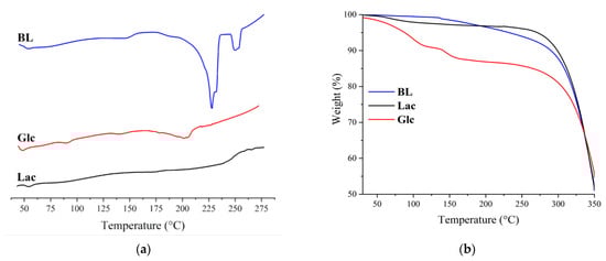 From the DSC results (Figure 13a), it is clear that the obtained polymers are characterized by two endo-effects of glass transition and melting temperature. For the BL polymer, the values are 54 °C and 228 °C; for Glc, 48 °C and 201 °C; and for Lac, 55 °C and 227 °C, respectively. It can be observed that, based on the ratio of glass transition and melting effects, the most crystalline is the BL polymer, and all synthesized polymers are thermoplastic. It is also evident that the temperature effects of betulin-based polymers do not change, regardless of their molecular weight. This can be attributed to the rigid structure of the betulin molecule. From the TG results (Figure 13b), it is clear that the obtained polymers are not thermally resistant polyesters, showing that the melting of these polymers proceeds with oxidation in air.