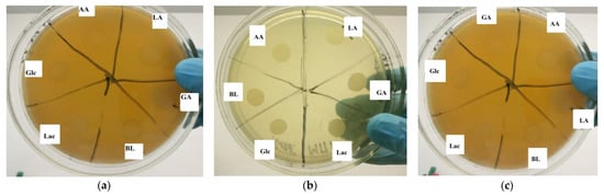 A 500 μL suspension of Bacillus L. plantarum with a concentration of 3 units, according to the McFarland turbidity standard using a dosator, was placed in 4500 μL of melted (45–50 °C) sterilized dense Moser–Rogosa nutrient medium (MRS) with crushed polymer films and cultivated in an incubator (Precise Shaking Incubator, WiseCube WIS-20, Daihan, Seoul, Republic of Korea) at 37 °C for 72 h. Moreover, we also investigated the toxicity of polymer samples from the culture of Lactobacillus plantarum in a liquid nutrient medium using spectrophotometry. The experiments were carried out in 8 test tubes of 10 cm3. For the cultivation of bacteria, liquid nutrient media MRS containing polymer samples Glc and BL at a concentration of 1% (wt.) were used; a control medium without polymer samples was also used. Polymer samples were introduced during medium preparation and autoclaved in a WiseCube autoclave at 121 °C for 20 min. A 3% (vol.) 20-h culture of L. plantarum was used as the inoculum (seed material). After inoculation, the cultures were incubated for 34 h at 37 °C with a stirring speed of 80 rpm in the CO2 incubator (Thermo Scientific, Waltham, MA, USA). Bacterial biomass increase was determined through a spectrophotometric method. The change in the optical density of the bacterial suspension was measured at intervals of 0, 4, 8, 12, 24, 28, 32 and 34 h of bacterial cultivation by using a UV-VIS spectrophotometer Cary 60 (Agilent Technologies, Santa Clara, CA, USA) at a wavelength of 540 nm and a cuvette thickness of 1 cm. Based on the optical density data, a graphical dependence was constructed in the coordinates A/A0—time, where A is the optical density at the current time and A0 is the optical density at time 0.