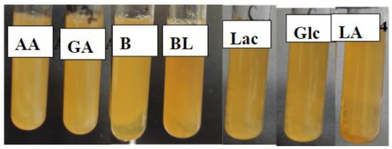 Moreover, when studying the effect of polymer samples (BL, Glc, Lac) on a culture of Lactobacillus plantarum in a liquid nutrient medium using spectrophotometry, a slight increase in the growth rate of the cell culture is observed. Betulin (B) was selected as a comparative sample, and its presence inhibited cell growth (Figure 16), aligning with the data obtained on cultivation in a dense nutrient medium.