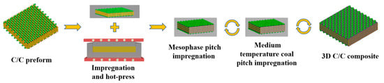 The 3D C/C preform was subjected to mesophase pitch impregnation (MPI) and subsequently densified via 2 MPa hot pressing and carbonization. The prefabricated body was compressed by 20% during molding in the thickness direction, consequently increasing the fiber volume fraction in the composite material by 20%. The 3D C/C composite material was further densified through multiple cycles of mesophase pitch impregnation, followed by carbonization–graphitization, achieving an average density of 1.83 g/cm3, and designated as C/C-MPI. Further densification was accomplished by infiltrating the C/C composites with medium-temperature coal pitch via high-pressure impregnation (IPI) and carbonization–graphitization conducted multiple times. Ultimately, 3D C/C composites with an average density of 2.02 g/cm3 were produced, referred to as C/C-MPI-IPI. The fabrication methodology for the high thermal conductivity carbon composite material is illustrated in Figure 2.