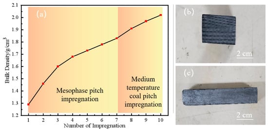Density curve of 3D C/C composite material with impregnation times (a) and physical photos of 3D C/C composite material (b,c).