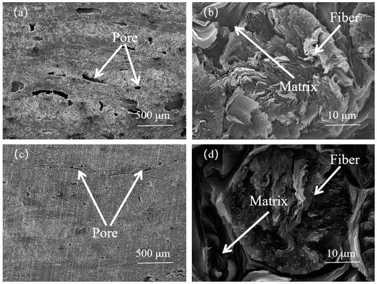 SEM images of 3D C/C composites in the X (Y) direction: (a,b) C/C-MPI, (c,d) C/C-MPI-IPI.
