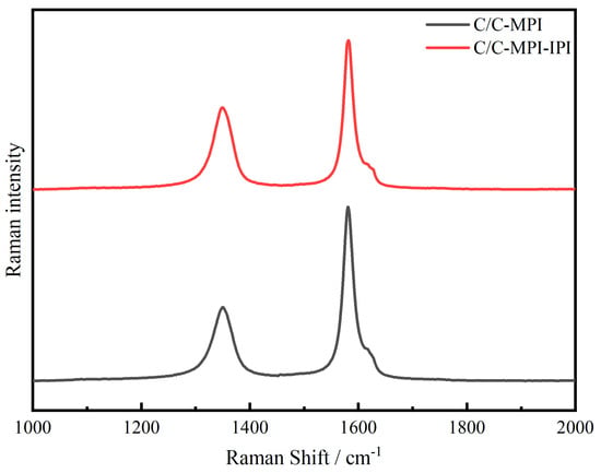 To investigate the impact of matrix carbon on the crystal structure of C/C composites, micro laser Raman spectroscopy was employed in this segment to characterize the structural parameters of the matrix carbon within the composites. Furthermore, the carbon fibers and matrix carbon were analyzed by selecting micron regions and stripping them apart. Figure 6 presents the Raman spectrum of the matrix carbon in 3D C/C composites, while Table 2 lists the corresponding peak intensities and R values derived from quantitative computation of the Raman spectrum, which represents the strength ratio of peak D and peak G (ID/IG) and indicates the defect in the graphite material. As can be observed from the figure, C/C-MPI exhibits a more pronounced D-peak intensity and a less significant G-peak intensity.