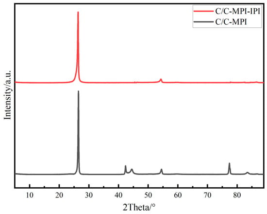 As per the values in the table, the R values for C/C-MPI and C/C-MPI-IPI are 0.24 and 0.52, respectively. A smaller R values indicates less defects in graphite materials. These results suggest a higher content of amorphous carbon in the C/C-MPI-IPI matrix carbon. This outcome is primarily due to the presence of a significant quantity of medium-temperature coal pitch matrix carbon within the C/C-MPI-IPI, which is optically isotropic and characterized by a disorganized molecular arrangement and poor orientation. The elevated carbon content of the mesophase pitch matrix enhances the overall graphitization degree and orientation of the C/C composite.