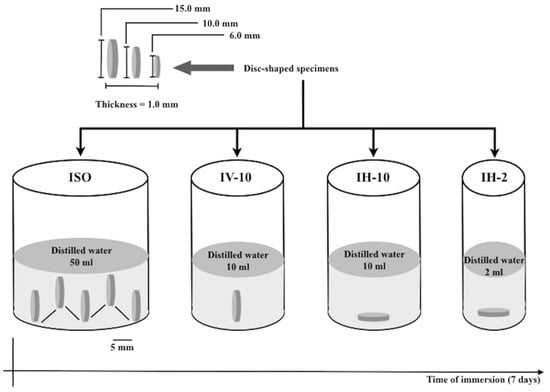For each resin-based restorative material, the specimens were immersed in distilled water at 37 ± 1 °C for 7 d according to the following immersion protocols (n = 5): ISO (all the specimens were vertically immersed in 50 mL of distilled water, maintaining a 5 mm distance from each other); IV-10 (specimens were individually and vertically immersed in 10 mL of distilled water); IH-10 (specimens were individually and horizontally immersed in 10 mL of distilled water); and IH-2 (specimens were individually and horizontally immersed in 2 mL of distilled water). Racks of nets with rips, glued in the internal wall of the vials, were used for positioning the specimens in the vertical position. The schematic drawing of the immersion protocols is depicted in Figure 1. After 7 d of water immersion, the specimens were removed from the vials, gently wiped with absorbent paper until the visible surface moisture was eliminated, and weighed (m2). Afterwards, the specimens were reconditioned to a constant mass (m3) using the same method as for m1.