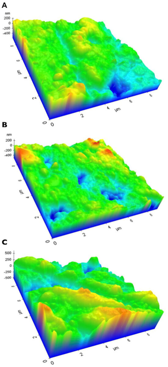 Representative 3D atomic force microscopy images of the three resin-based restorative materials before Wsp and Wsl evaluation: (A) resin composite, (B) resin cement, (C) adhesive system.