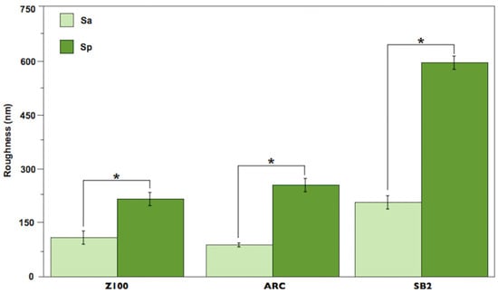 Representative three-dimensional atomic force microscopy images showing the topography of the three resin-based restorative materials are presented in Figure 2: (Figure 2A) resin composite, (Figure 2B) resin cement, (Figure 2C) adhesive system. All the materials showed irregular surfaces, with the presence of craters and peaks of different heights. For the three resin-based restorative materials, Sp was statistically higher than Sa (Figure 3): SB2 (604.2 ± 18.9 nm > 209.1 ± 16.9 nm), Z100 (215.6 ± 18.7 nm > 112.3 ± 19.3 nm), and ARC (255.2 ± 17.3 nm > 93.0 ± 5.8 nm) (p < 0.05).