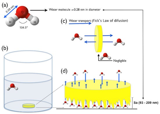 Theoretical model for water diffusion through a specimen horizontally positioned during water sorption and solubility evaluation: (a) water molecule, (b) specimen horizontally immersed in water, (c) water transport according to Fick’s law of diffusion, (d) diffusion of water molecules through the rough bottom of the specimen.