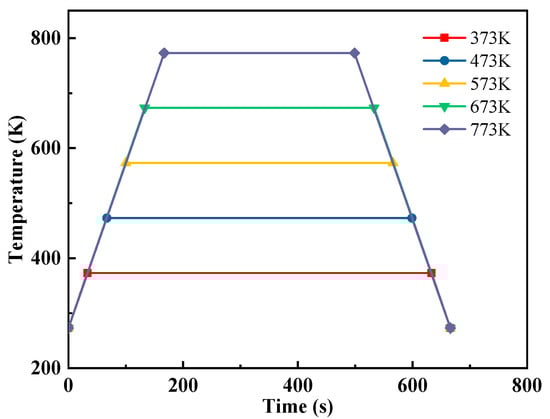 Over the course of the high-temperature residual tensile strength test, the 3D-printed dog bone sand specimen undergoes initial heating treatment within a resistance furnace. The heating temperatures are precisely controlled at 373 K, 473 K, 573 K, 673 K, and 773 K, with a set heating rate of 3 K/s. Once the furnace temperature attains the specified level, it is maintained for 600 s to ensure uniform heating throughout the sand specimen, as illustrated in Figure 2. Subsequent to insulation, the sand specimen is removed from the resistance furnace and allowed to undergo natural cooling at room temperature. Upon cooling to room temperature, the tensile strength test is conducted to characterize the high-temperature residual tensile strength of the sand specimen.