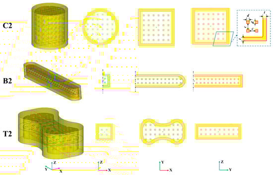 In this study, FT-Hollow (a software developed by us) [19] was used to design the strength-testing sand mold specimens, consisting of an outer shell and an inner support structure. Five sets of specimens were designed for each of the three tests: compressive, bending and, tensile strength. Table 1 lists the hollow types and design parameters of these sand mold specimens. As an example, Figure 3 and Figure 4 show the internal structure of the specimen for the Truss No. 2 and Multi-layer Shell No. 5 specimens. Specimen No. 1 is dense for the control experiments. Specimen Nos. 2, 3, and 4 are truss hollow structures; the spacing between trusses (c) is 5 mm, but the thickness of the outer shell (t) of the specimens and the cross-section size of the trusses (d) are different. Specimen No. 5 has a multi-layer shell structure with a thickness of 3 mm for each layer, and the shells are connected to one another by a truss support structure. It is worth noting that due to the limited height of the bending and tensile specimens, the number of shells in the vertical direction of specimen Nos. B5 and T5 is set to 2, and the number of shells in the vertical direction of the compressive specimen No. C5 is set to 3.
