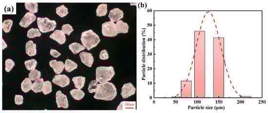 These sand molds were 3D printed with an ExOne Smax 3D Printer, which is produced by the German company ExOne (Gersthofen, Germany). Firstly, the sand grains were mixed with a curing agent, then the curing agent-coated sand grains were sequentially spread over the worktable, and afterward, the binder was injected through a printing head that consists of hundreds of tiny nozzles, following the profile of each section of the mold. This printing process occurred layer by layer until the mold was complete, with a printed layer thickness of 0.2 mm. The original sand utilized in this experiment is silica sand, with a purity of approximately 99.4% SiO2 and low humidity. The particle morphology and particle size range of the silica sand grains used for printing are illustrated in Figure 5. The sand grain size is mainly distributed in a range of 100–150 μm, and the shape is irregular. The binder employed in this experiment was a furan resin binder, with a spraying amount equivalent to about 1.6~1.8% of the weight of the silica sand. The curing agent was a sulfonic acid curing agent, comprising approximately 0.2% of the weight of the silica sand. It should be noted that the loose sand within the hollow part of the hollow sand mold was not cleaned during the strength test.