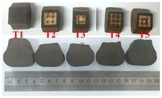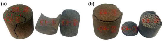 Figure 7 illustrates the fracture conditions of sand specimens No. C1 and No. C4 after the compressive test. The dense sand specimen No. C1 exhibits cracking along the middle and sides of the upper surface, resulting in the specimen being bifurcated—representing a comprehensive fracture. On the other hand, the truss hollow sand specimen No. C4 experiences a split solely on the entire upper surface, with the main body of the sand sample remaining uncracked, presenting a relatively complete structure. The damage from the applied test load on the hollow sand mold is partial. This observation suggests that the compressive load does not propagate into the interior of the hollow sand specimen along the outer surface. The hollow structure effectively hinders the transfer of force from the outside to the interior of the hollow sand specimen, thereby contributing to the preservation of the hollow sand mold’s integrity during the casting process. This structural integrity makes it less susceptible to the development of penetrating cracks. Furthermore, during the test process, due to the loose sand within the hollow part not being cleaned, this loose sand demonstrated some compressive resistance.