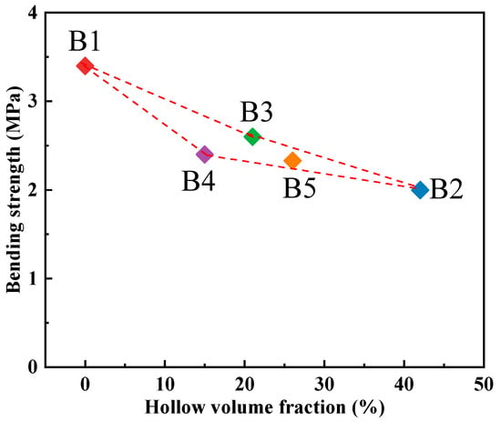 Relation curve between hollow volume fraction and bending strength of sand specimen.