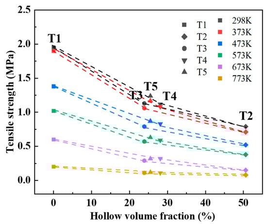 Figure 10 depicts the high-temperature residual tensile strength of five sand specimens with different hollow volume fractions under varying heating temperatures. As observed in Figure 10, the high-temperature residual tensile strength decreases as the heating temperature increases. Moreover, at equivalent heating temperatures, the high-temperature residual tensile strength of dense sand specimens surpasses that of hollow sand specimens. At room temperature, the tensile strength of the dense sand specimen No. 1 is the highest at 1.95 MPa. In contrast, the room-temperature residual tensile strength of the hollow sand specimens (No. T2, No. T3, No. T4, and No. T5) is 0.79, 1.13, 1.12, and 1.24 MPa, respectively. This signifies a reduction in the residual tensile strength by 36% to 59% compared to dense sand specimens. This disparity primarily stems from the absence of a binder within the hollow part of the hollow sand molds.