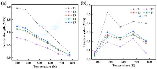 (a) Variation in high-temperature residual tensile strength of sand molds with temperature; (b) the decrease in high-temperature residual tensile strength with increasing temperature.