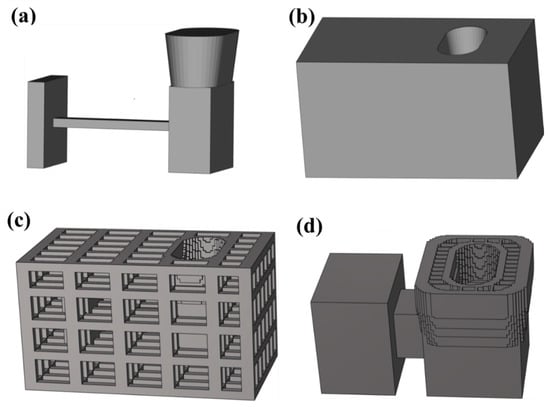 The design of casting and sand molds: (a) casting, (b) P1DN, (c) P2TN, and (d) P3SN [20].