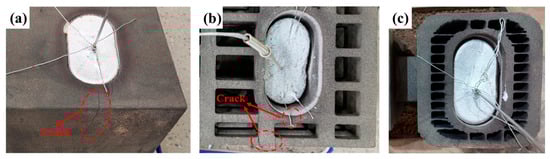 The cracks in the sand molds: (a) P1DN, (b) P2TN, and (c) P3SN [20].