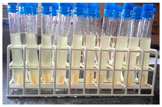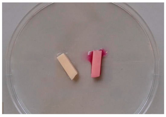 Using a modified Richards qualitative method [22], the production of bacterial and fungal biofilms on the surface of samples of zirconium oxide material was studied. Sterile samples of prosthetic materials were added to TSB (TrypticSoyBroth) medium (BD, Haidelberg, Germany) after a 24 h culture yielded a suspension with a density of 1.0 on the McFarland scale (Figure 3). The samples were incubated for 24 h at 37 °C. Following this time, they were rinsed three times with NaCl, and then 1 drop of 1% 2,3,5-triphenyltetrazolium chloride (TTC) solution was added. Once more, the samples were incubated at 37 °C for 24 h. Every test was run in triplicate. An intensity of color scale with three levels was used to interpret the data.