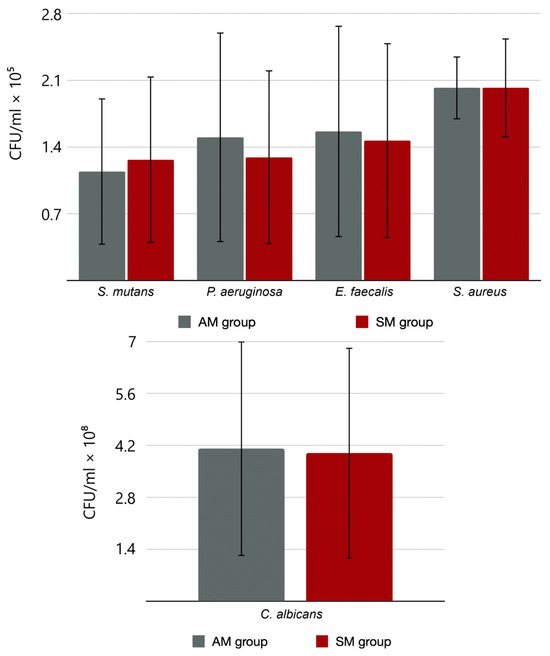 The results of biofilm formation in the quantitative method for all strains in both materials show differences, but at the significance level of p < 0.01, they are not statistically significant. The mean CFU/mL (colony forming unit) and its standard deviation for individual microorganisms are shown in Figure 5.