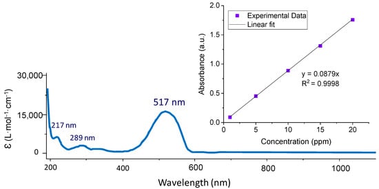 Dye degradation was monitored every 10 min for 1 h using a quartz cell in a spectrophotometer (Cecil CE 1011, Cecil Instruments Limited, Cambridge, UK) at a wavelength of 517 nm. Figure 1 displays the UV absorbance spectra of the methyl red solution; the maximum absorption peak is in accordance with the literature [38]. The calibration of absorbance vs. concentration obtained at 517 nm is shown in the inset in Figure 1.