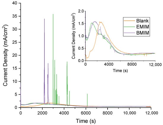 It is important to mention that different concentrations (5%, 10%, 30%) of [BMIM][BF4] and [EMIM][BF4] were used to anodize tungsten. However, the best photoelectrocatalytic performance (Figure S1) was achieved by low-IL-concentration nanostructures (5%). Figure 2 displays the current density–time data registered during anodization in the blank electrolyte (without ILs) and in both ionic liquids (EMIM and BMIM). A magnified inset plot is shown to enable a proper view the current density transients of each sample. In this figure, the current density values reached during the synthesis process and their shapes can be examined.