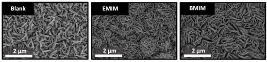 The FESEM images shown in Figure 3 were taken to study the influence of ionic liquids on the WO3 nanostructures synthesized via electrochemical anodization. The images show the morphology of the samples synthesized without ionic liquid and of samples for which 5% v/v EMIM or BMIM was added to the anodization electrolyte. In the three studied cases, the formation of nanoplates can be observed, which increase in length and number with the addition of ionic liquid. This behavior is in agreement with what was expected according to the anodization curves studied in the previous section, since the nanoplates synthesized with EMIM or BMIM begin to precipitate before those formed with the free electrolyte. According to Figure 2, the second stage (precipitation stage) starts at 1100 or 1700 s for the samples synthesized with EMIM or BMIM, respectively, while, for the blank electrolyte, it starts at ~2000 s. Therefore, the nanoplates synthesized with ionic liquid have more time to form and grow. All of this leads to a higher surface area of the nanostructures. Moreover, the larger number of nanoplates in the EMIM sample can also be explained by the precipitation stage beginning earlier, as the peak is reached before for this nanostructure (Figure 2).