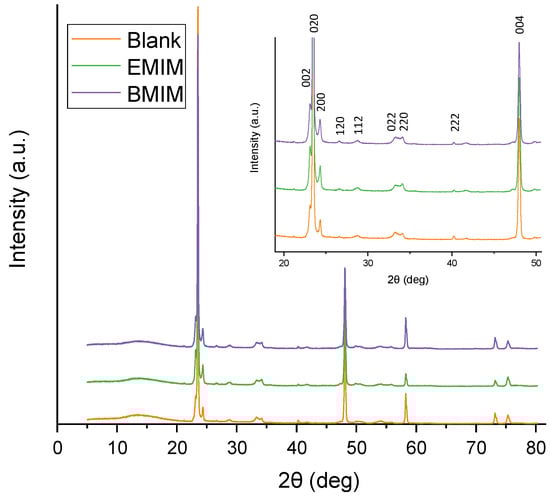 Additionally, the three samples had a good crystalline structure; however, those synthesized with EMIM and BMIM presented a smaller crystallite size. Therefore, the probability of recombination of the electron/hole pair is lower than for the sample synthesized with the blank electrolyte [70].