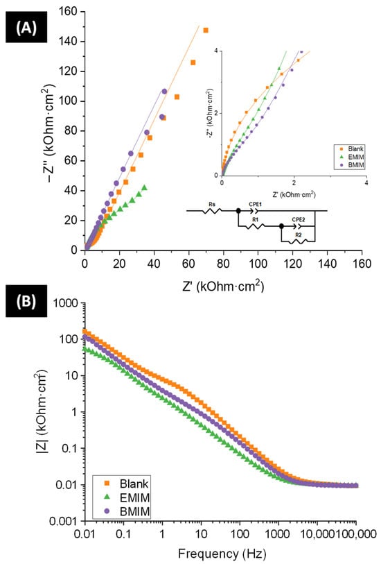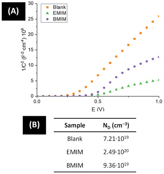 Generally, the semicircle amplitude is proportional to the impedance of the related electrochemical process. Observing Figure 5, the Blank sample presents the largest semicircle. This fact is confirmed in Figure 5B, where the values registered at the lowest frequency in the plot represent the total resistance offered by each nanostructure (RT). These results are presented in Table 4. As observed, the Blank sample presents a higher RT. It is confirmed that the addition of ionic liquid to the anodizing electrolyte decreases the total resistance to charge transfer of the tungsten nanostructures. It is important to highlight that the total resistance (RT) is lower for the WO3 nanostructure synthesized with EMIM than for the one synthesized with BMIM. This result is due to the shorter structural chain of EMIM which, therefore, makes it a slightly better complexing agent than BMIM. Additionally, EMIM nanostructures with larger surface areas have been obtained and this decreases the resistance they offer and increases their donor density [55].