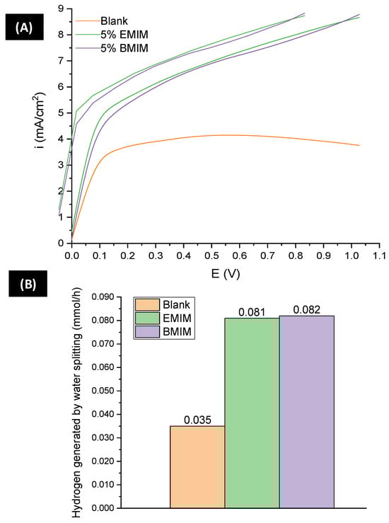 In particular, during the splitting of water using EMIM and BMIM samples, the generation of hydrogen was increased by 132% and 135%, respectively, when compared to the hydrogen production of the blank sample. Moreover, with the application of IL samples as photoelectrocatalysts in the photoelectrodegradation of methyl red, a 100% degradation efficiency was achieved after 50/60 min. To sum up, these results exhibit how IL-anodized nanostructures can be used for efficient and fast methyl red degradation involving a lower energy consumption, since less time is needed for a higher percentage of elimination.