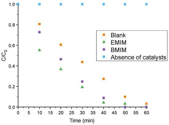 In this analysis, a starting dye concentration of 20 ppm was used and, measuring the absorbance at ~517 nm using a spectrophotometer, the elimination of the dye was evaluated every 10 min. According to the obtained results, the concentration of methyl red without catalysts remained constant during the experiment, showing that there is no degradation of the dye. On the other hand, the nanostructures synthesized with ionic liquid exhibit a better performance than the sample synthesized with a blank electrolyte, since complete degradation of the dye was achieved after 60 or 50 min when using the nanostructures synthesized with EMIM or BMIN, respectively, while, for the reference sample, 60 min was not enough to degrade the whole dye. It is important to note that the sample anodized without ionic liquid always had a lower percentage of elimination than the anodized samples with ionic liquids. Taking a closer look at the degradation at 40 min, both nanostructures anodized with EMIM and BMIM achieve more than 90% MR degradation, while for the blank this value was close to 70%, which means that it is possible to reduce the energy consumption necessary to degrade a high percentage of methyl red dye using ILs as electrolytes. At 60 min, the sample without ILs managed to degrade most of the dye because it is also a nanostructured area with photoelectrocatalytic activity and, with longer durations, it has the capacity to completely degrade methyl red.