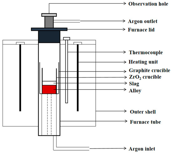 The first step involves placing 500 g of the alloy and 60 g of slag into a ZrO2 crucible, which is lined with a 0.2 mm thick molybdenum sheet. Then, the ZrO2 crucible should be placed inside the graphite crucible to prevent the liquid metal leakage under elevated temperature conditions. After placing the graphite crucible inside the resistance furnace, initiate the power supply of the resistance furnace and increase the temperature to 1873 K at a rate of 10 K/min. Maintain this temperature for a duration of 60 min, subsequent to which, turn off the power and permit the furnace to cool down to the ambient temperature. During the whole experiment, the resistance furnace is injected with argon gas at a flow rate of 5 L/min to prevent the reaction between oxygen and the liquid metal.