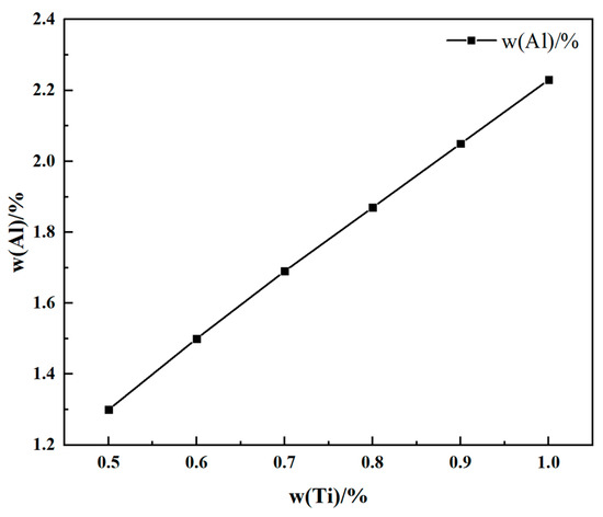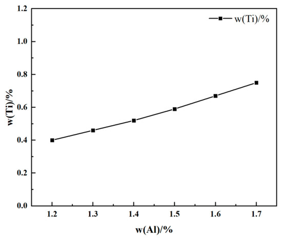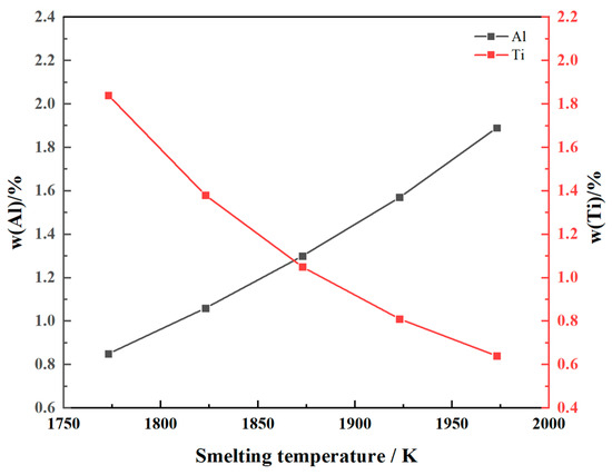 The influence of the smelting temperature on the equilibrium contents of Al and Ti when the composition of slag system components remains constant is illustrated in Figure 2. The figure demonstrates that an increase in the smelting temperature impedes the burning loss of Al, while a decrease in the smelting temperature hampers the burning loss of Ti. This phenomenon is consistent with the results of Shen et al. [30]. They point out that with temperature increases in a constant slag composition, the Ti content decreases drastically and the Al content increases.