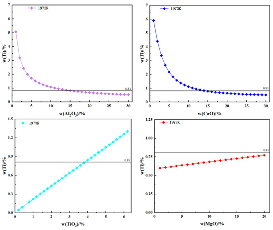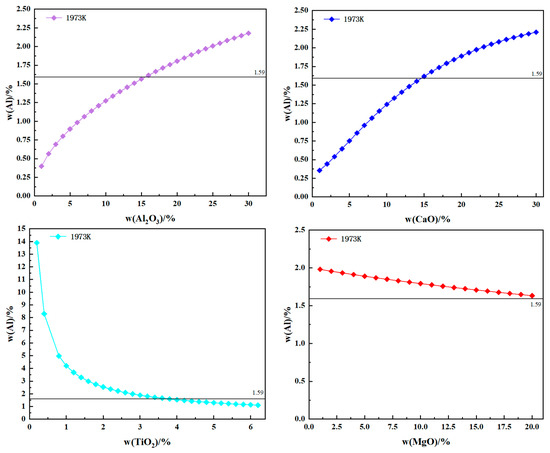 The relationship between the components of the slag system and the equilibrium contents of Al and Ti is investigated at a smelting temperature of 1973 K. The relationship between the content of Al and slag system components is illustrated in Figure 3. Similarly, Figure 4 illustrates the relationship between the content of Ti and slag system components. It is necessary to keep the proportional fractions of the contents of several other components in the slag constant when calculating the effect of one component of the slag system on the equilibrium Al and Ti contents. Take CaO as an example: when exploring the effect of CaO on the equilibrium Al and Ti content, the slag system group element mass fraction changes to CaF2:CaO:Al2O3:MgO:TiO2 = 50:XCaO:22:5:3, i.e., when the CaO mass fraction changes to 21%, the CaF2 mass fraction subsequently changes to 79 × 50/80 = 49.375%, and the other group element changes are also the same.