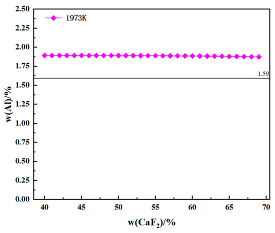 The temperatures at the electroslag remelting electrode, droplet, and molten bath are believed to be 1750 K, 1948 K, and 1948 K, respectively; the temperature of the slag–alloy interface is 1950 K, according to Mitchell [29]. Therefore, this paper selects five temperatures for research: 1773 K, 1823 K, 1873 K, 1923 K, and 1973 K.