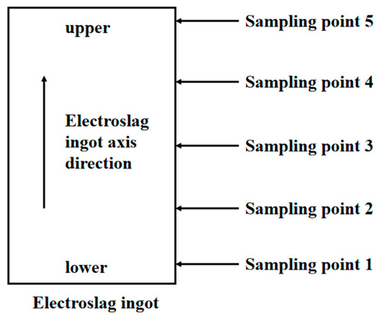 Based on the theoretical calculations, the smelting temperature was elevated and adjustments were made to the content of each component in the slag system. The slag–alloy balance experiment was conducted using the adjusted slag system, and the smelting outcome was compared to that of the S2059 slag system. The electroslag ingot was sampled and analyzed after the experiment. The sampling diagram of the electroslag ingot is shown in Figure 7.