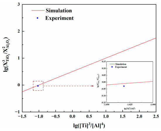 In order to verify whether the thermodynamic model is consistent with the experimental results, Equation (2) could be changed to Equation (13). The relationship between and can be obtained from the slag–alloy equilibrium test results and the interaction concentration of the slag system components calculated by the model. As shown in Figure 8, the experimental results are in good agreement with the model calculation, indicating that the established thermodynamic model is reasonable.