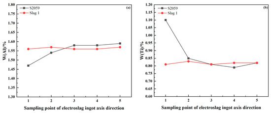 The distribution of Al and Ti elements in the electroslag ingot is illustrated in Figure 9 shows that the fluctuation ranges of Ti and Al contents are 0.01% and 0.02%, respectively, indicating that the precise control of Al and Ti contents has been preliminarily achieved in the ESR of the ATI 718PlusTM alloy. Compared with the smelting results of the S2059 slag system, the distribution of Al and Ti elements along the axial direction of the electroslag ingot is uniform. In the beginning of smelting with the S2059 slag, the occurrence of “burning Al increases Ti” is observed. Due to the high TiO2 content in the S2059 slag system, a significant consumption of aluminum takes place during the initial smelting phase, resulting in an increased production of titanium. As smelting progresses and a portion of TiO2 in the slag becomes depleted, Equation (1) reaches a dynamic state.