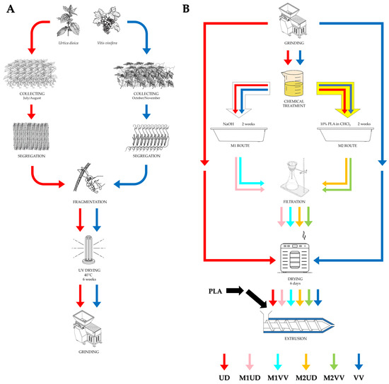 A diagram showing the modification method of natural fibers and the obtainment of polylactide biocomposites that include them. (A) raw materials collection; (B) samples preparation.