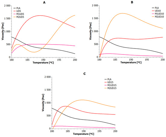 Viscosity versus temperature curves for PLA composites with Urtica dioica: (A) 5 wt%; (B) 10 wt%; and (C) 15 wt% of unmodified fibers, fibers modified with route M1, and fibers modified with route M2.