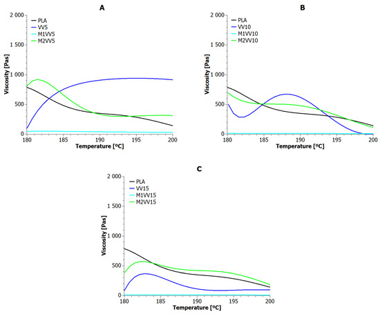 Viscosity versus temperature curves for PLA composites with Vitis vinifera: (A) 5 wt%; (B) 10 wt%; and (C) 15 wt% of unmodified fibers, fibers modified with route M1, and fibers modified with route M2.