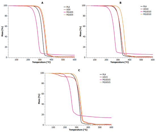 TGA curves for PLA composites with Urtica dioica: (A) 5 wt%; (B) 10 wt%; and (C) 15 wt% of unmodified fibers, fibers modified with route M1, and fibers modified with route M2.
