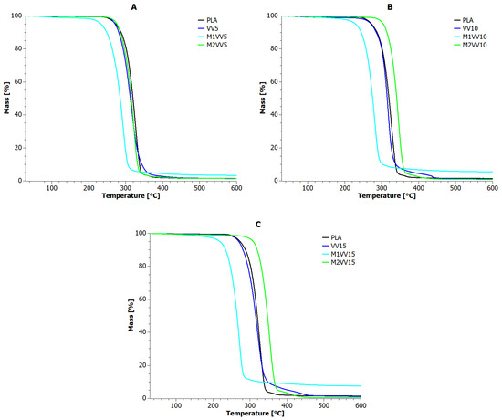 TGA curves for PLA composites with Vitis vinifera: (A) 5 wt%; (B) 10 wt%; and (C) 15 wt% of unmodified fibers, fibers modified with route M1, and fibers modified with route M2.