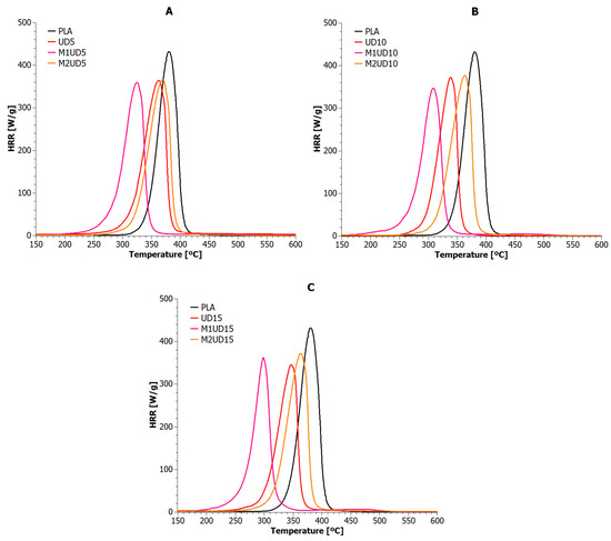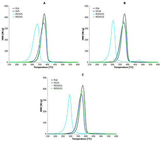Heat release rate versus temperature for PLA composites with Vitis vinifera: (A) 5 wt%; (B) 10 wt%; and (C) 15 wt% of unmodified fibers, fibers modified with route M1, and fibers modified with route M2.