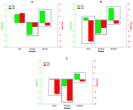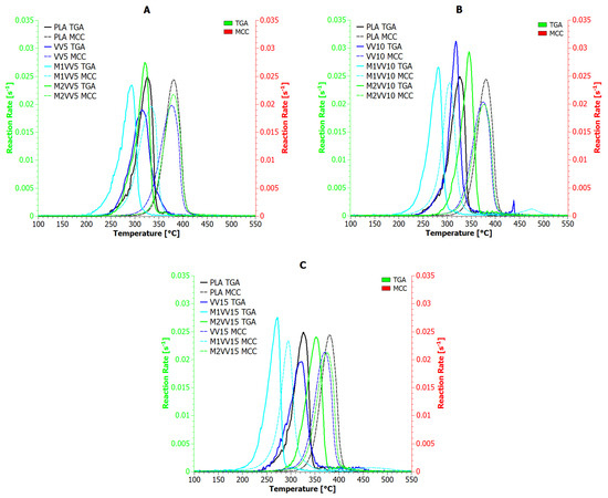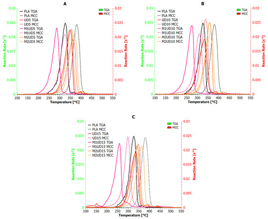 Figure 8 and Figure 9 show the results of the reaction rate (RR) of decomposition determined based on TGA (green X-axis) and MCC (red X-axis) measurements for composites containing Urtica dioica and Vitis vinifera fibers, respectively. Based on the presented analysis, it can be concluded that the rate of the composite decomposition reaction depends on the rate of the combustion process. For example, for UD, M1UD, and M2UD composites, the difference between the maximum points of the decomposition reaction rate for the TGA and MCC curves is identical at 5 and 15 wt% (Figure 8A,C and Figure 9A,C), and the smallest for composites filled with 10 wt%. In turn, for the VV, M1VV, and M2VV composites, as the share of fibers in the composite increases, the differences between the maximum points of the decomposition reaction rate for the TGA and MCC curves decrease.