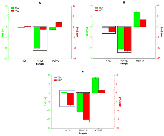 The most promising type of modification turned out to be the M2 route. Almost all biocomposite samples containing natural fibers modified according to the M2 route were characterized by improved thermal properties compared to PLA. The only sample that did not meet all the necessary criteria was M2VV5. This may mean that, in the case of Vitis vinifera fibers, filling the matrix with their content above 5% by mass may provide an effective thermal stability effect (Figure 5B,C).