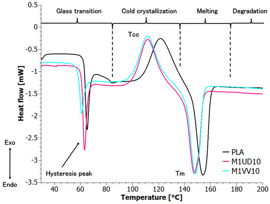 In general, the addition of unmodified Urtica dioica fibers and those modified with the M2 route resulted in an increase in the viscosity of the composites over the entire measurement range. Nevertheless, the M2 modification allowed to achieve higher mass viscosity than the addition of unmodified fibers. This is because the Urtica dioica fibers were additionally encapsulated in a polymer layer before being added to the biopolyester alloy. As shown in Section 5.5, at 190 °C, the biopolymer material was in a molten state and underwent thermo-oxidative degradation. The consequence of further heating of the material under these conditions is the formation of solid char, which causes an increase in viscosity (Figure 2A). The higher the tendency to carbonization, the more pronounced the effect of the changes. The change in viscosity is caused by the disruption of the normal flow of the polylactide, as the fiber and char particles impede the mobility of the chain segments [65]. In turn, the mercerized fibers (M1) plasticized the matrix under processing conditions. This plasticization increased with the amount of these fibers in the biocomposite (see Figure 2A–C). Among the M1UD samples, only the one containing 5 wt% showed results comparable to PLA. It was the first indication that the mercerization of Urtica dioica fibers with a NaOH solution removes substances capable of protecting against high temperatures. However, E. Brodos et al. reported that, to improve homogenize natural fibers, the melt viscosity should be 100 Pas. In the presented case, this condition was met only by samples containing mercerized natural fibers [66].