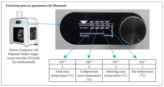 The PLA and CBSW powders were initially combined manually at room temperature before being introduced into the extrusion chamber of the 3Devo Composer 450 Filament Maker single-screw extruder (Utrecht, The Netherlands,), as reported in Figure 1.