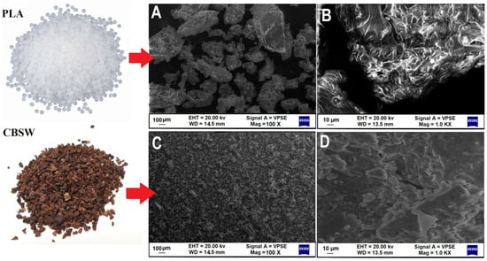 After the milling process, SEM images (Figure 2A,B) at high magnifications (100ϗ and 1000ϗ) of the neat PLA particles show an irregular, square shape and a diameter up to about 500 μm. The cocoa bean shell waste (CBSW) was supplied in the form of a coarse-grained, inconstant powder, after grinding the cocoa bean shell. Furthermore, as visible from the SEM image (Figure 2C,D), the CBSW particle size varies from about 5 μm to about 200 μm.